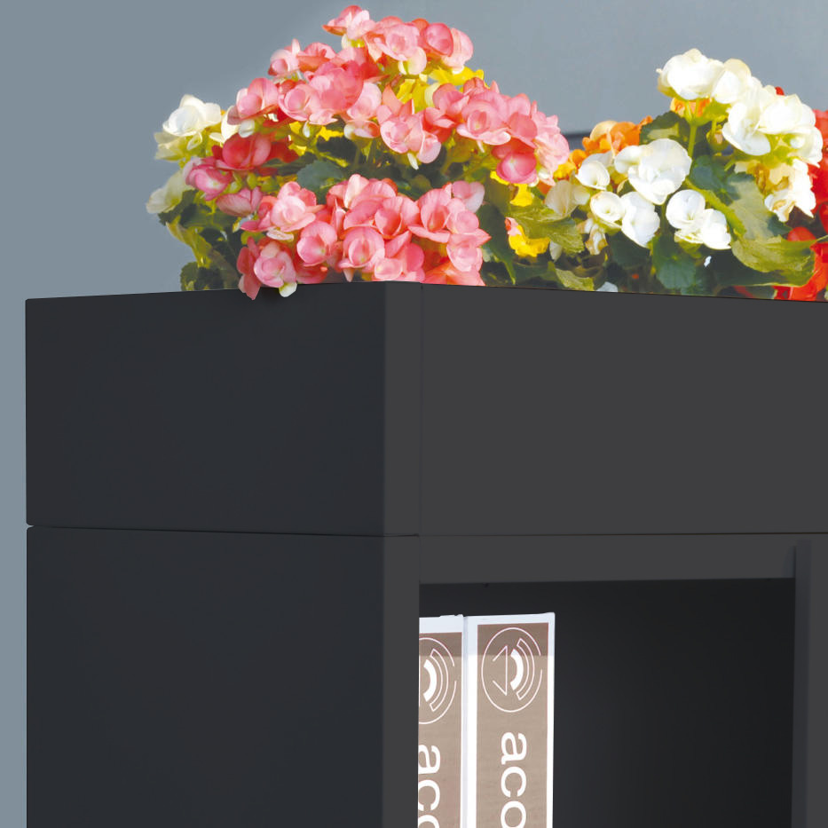 Zwart – RAL9005 - De plantenbak is standaard geschikt voor kunstplanten. Indien gewenst is er de mogelijkheid om speciale binnen bakken of vijverfolie te bestellen voor het plaatsen van echte planten in de bakken.